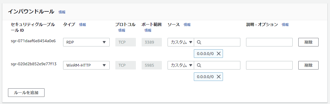 AWSでは、インスタンスに対して「WinRM-HTTP(5985番ポート)」もしくは「WinRM-HTTPS(5986番ポート)」を開放します。