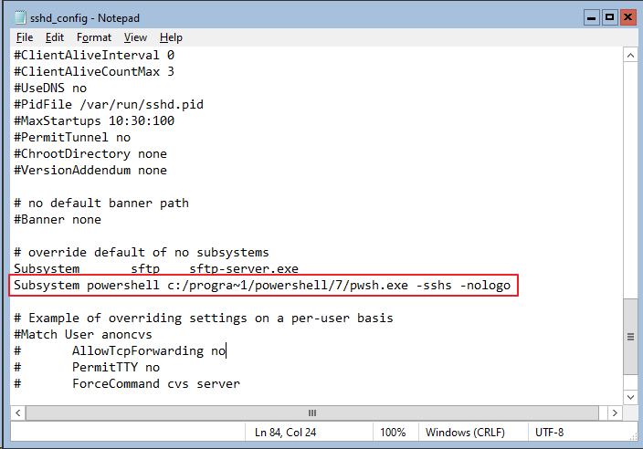 こちらの公式手順に従って、「Subsystem powershell c:/progra~1/powershell/7/pwsh.exe -sshs -nologo」を追記します。