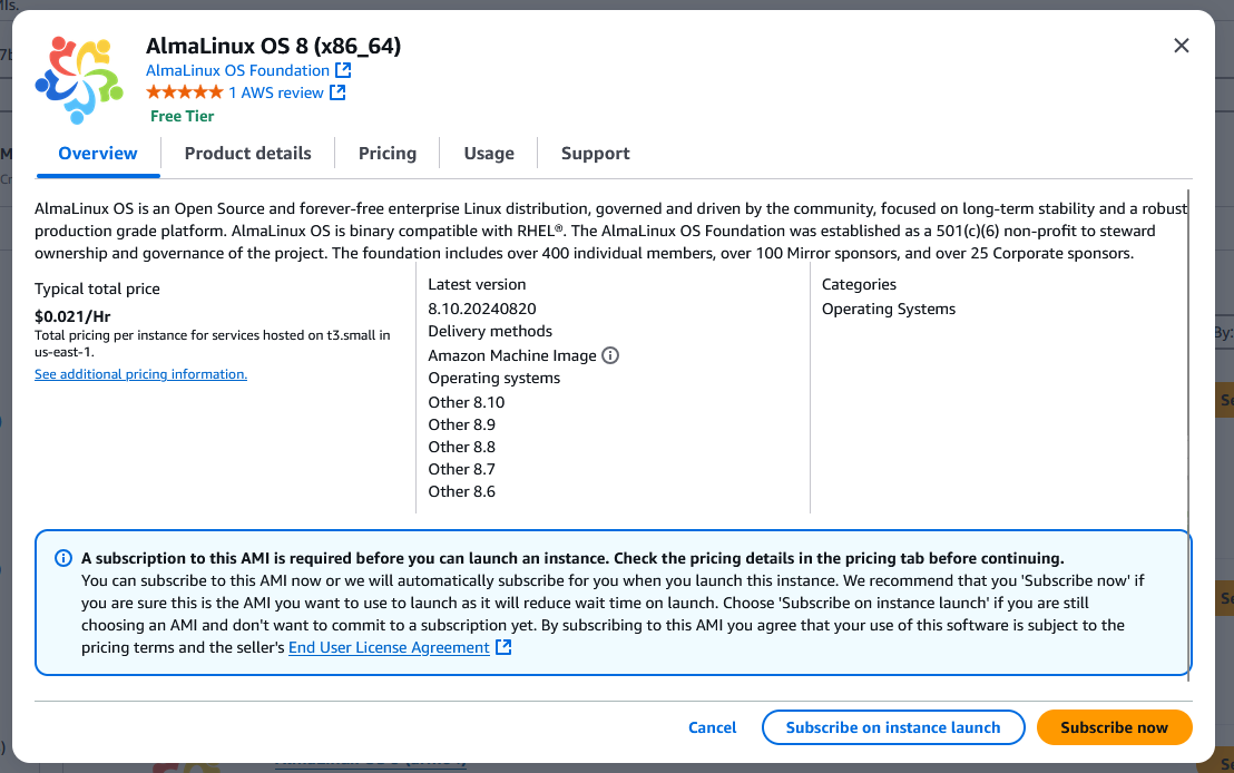 AlmaLinuxはAWSの標準AMIで提供されていないため、Marketplaceのものを使用します。公式のAlmaLinux OS Foundationから提供しているものを使いましょう。サブスクリプションが必要ですが、費用はかかりません。また、t2.microなどのFree Tierインスタンスで起動すれば、Free Tierの利用も可能です。