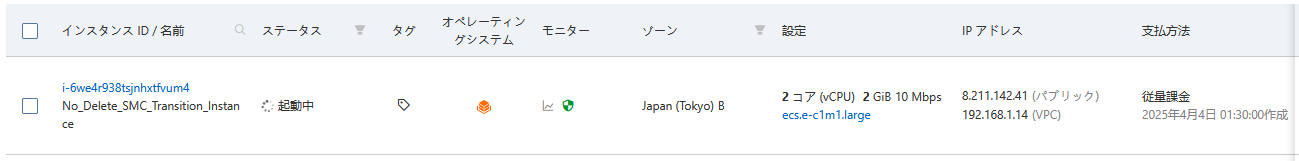 では、実際にECSインスタンスを作成して、移行結果を確認してみます。「インスタンスを作成」をクリックして、通常のECSインスタンス作成手順で作成します。作成後、ECSインスタンスは自動的に起動しますが、起動SSHログインできるまでは後数分間かかるようです。